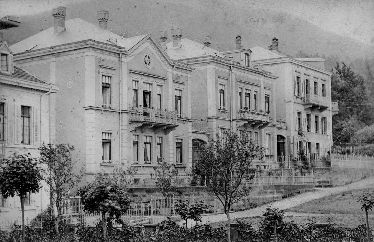 Die Häuser gegenüber dem Hotel Römerbad erscheinen im Großen und Ganzen noch wie vor 130 Jahren. Einige charakteristische Details sind jedoch verlorengegangen.
