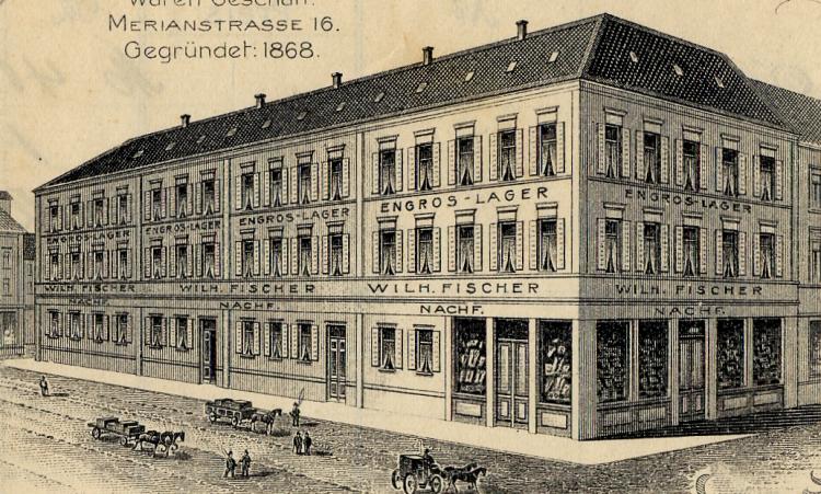 Die Großhandlung Wilhelm Fischer Nachfolger befand sich in der damaligen Merianstraße 16, Ecke Merianstraße und Lindenstraße (heute Gutenbergstraße). Der Gebäudekomplex erstreckte sich von der Merian- bis zur Predigerstraße. Kopf einer Rechnung die 1912 ausgestellt wurde |
