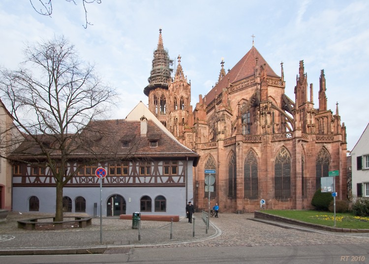 Die Münsterbauhütte an der Herrenstraße. Ansichtskarte mit ungeteilter Adressseite, um 1900mit Ansichten 2007 und 2010 zurück zur Kaiserstraße bis Schlossberg Impressum