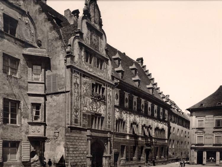Das Foto zeigt das sogenannte alte Rathaus mit der neuen Bemalung von Fritz Geiges. Die vorherige Bemalung musste bereits wenige Jahre nach ihrer Anbringung ersetzt werden, da sie stark verblasst war und die Farbe abzublättern begann.