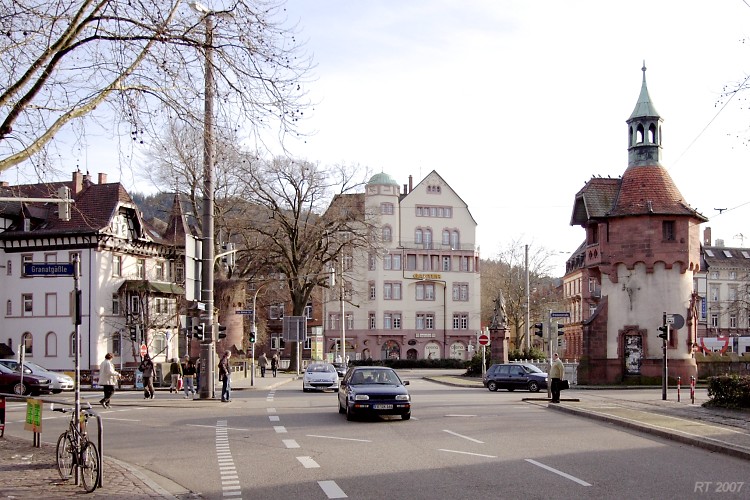 Die Schwabentorbrücke von der Stadtseite aus gesehen. Ansichtskarte mit geteilter Adressseite, ca. 1905mit der Ansicht 2007 zurück zur Dreisam Impressum