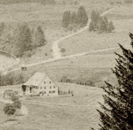 Blick über den noch nicht vorhandenen Ort Titisee. Das Gebiet des heutigen Ortes Titisee ist noch weitgehend unbebaut. Am Ufer steht das erste Hotel, das "Hotel Titisee", das "Schwarzwald Hotel" wird erst drei Jahre später als zweites Hotel folgen. Im gleichen Jahr wird die Höllentalbahn den Titisee erreichen.