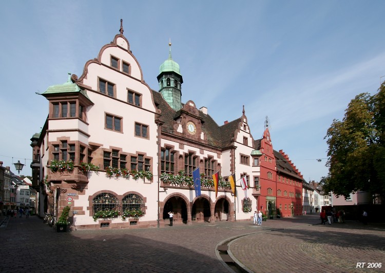 Blick auf das alte und das neue Rathaus sowie das Denkmal von Berthold Schwarz Ansichtskarte mit ungeteilter Adressseite, um 1900mit der Ansicht 2006 zurück zum Rathaus und Umgebung zurück zu den Ansichtskarten von Ludwig Zorn Impressum